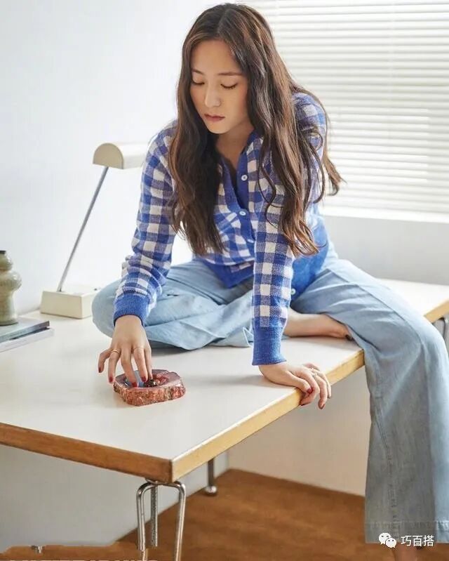 这次的杂志真的很亲民,摆的各种pose都是大家都尝试过的,女生是一种“软骨”动物,走到哪里做到哪里,能躺着绝不坐着,能坐着绝不站着。这不,郑秀晶欧尼充分展示了这一特点,不在地毯上躺着改坐在桌子上了,盘腿而坐洒脱自然,手里摆弄着小玩意孩童气十足,谁能想到这是一个26岁的女生呐!