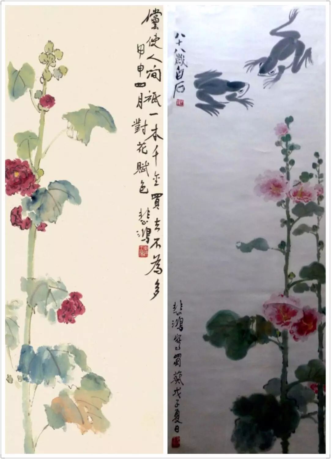 ▲ 徐悲鸿《蜀葵》(左),齐白石、徐悲鸿“双星合璧”的《蜀葵蛙》(右)