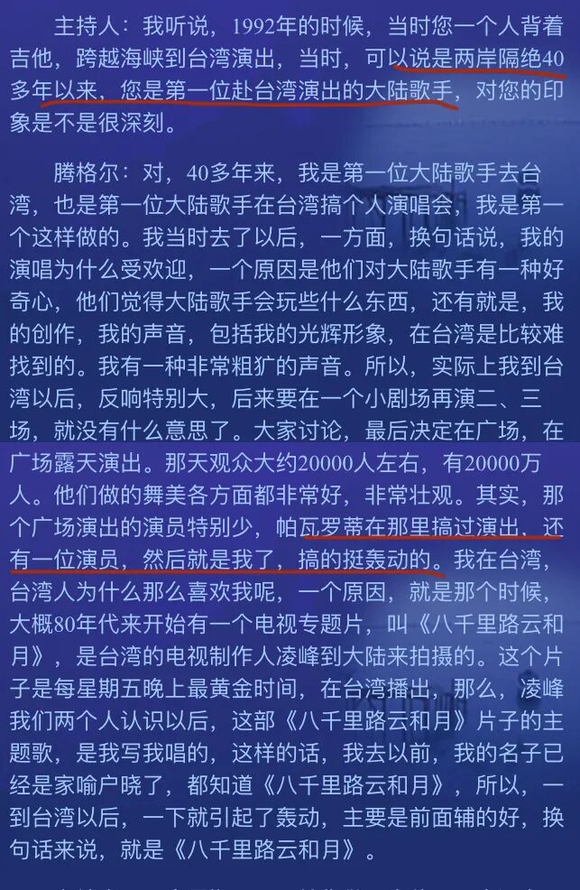 92年的时候腾格尔作为两岸隔绝40多年以来第一个去台湾开演唱会的大陆歌手,还造成了相当轰动的效果。真正的交流。