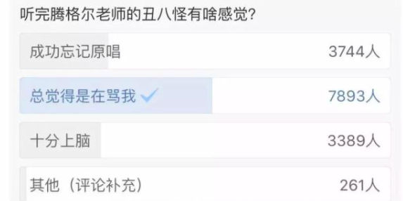 听薛之谦唱《丑八怪》你会觉得他太惨了太丑了太可怜了,听腾格尔唱《丑八怪》你只会觉得诶怎么回事?我怎么觉得我被骂了?妈!有人在电视上骂我丑!