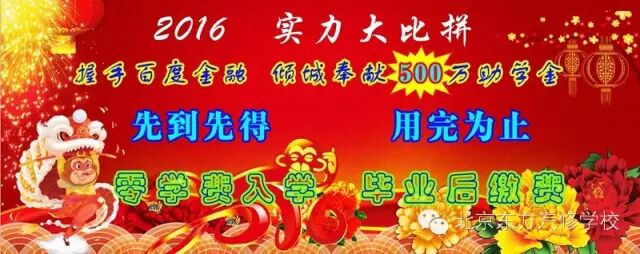 猴年势力之巅 零学费入学 常年免费试学 毕业后缴费 学校开设五大专业: 1、汽车维修专业 2、汽车美容装饰专业 3、汽车钣金喷漆专业 4、汽车调漆专业 5、汽车彩绘专业 2016年我校特别推出200万助学金 用完为止 报名从速 咨询电话400-888-6695 010-51285295 北京东方汽修学校 微信号:bjdfqx