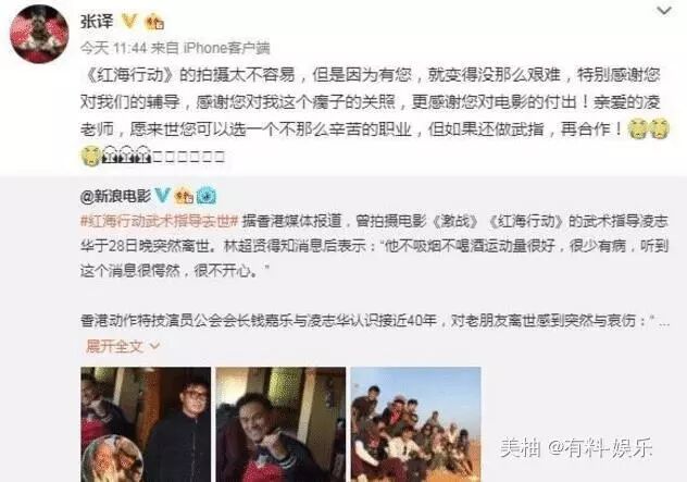 近日张译突然在微博上发文:亲爱的凌老师,愿来世你可以选一个不那么辛苦的职业,但如果还做武指,再合作!这也是让网友们纷纷摸不清头脑,后来大家看到照片才知道,原来是娱乐圈中的武术指导老师凌志华走了。凌志华平时不抽烟不喝酒,还非常喜欢运动,但是说去世就去世了,完全没有任何的预料。只能说这个世界上,很多事情说发生就发生了,让人都意料不到。