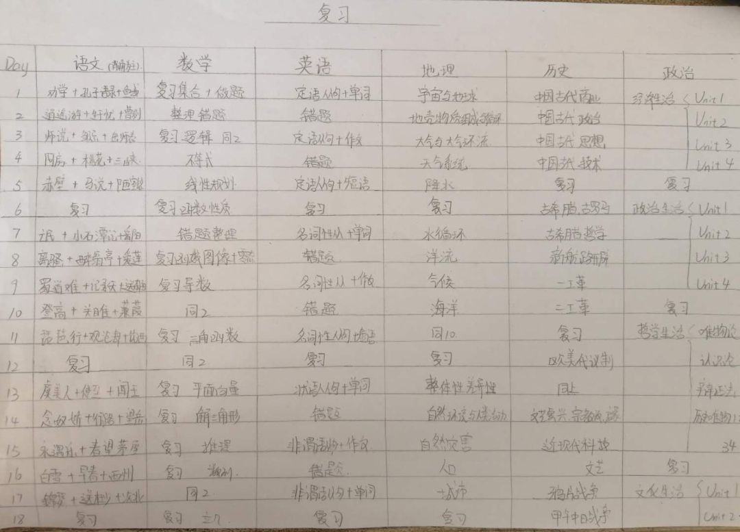 ☑每天早晨6:40起床,洗漱后,来到书桌前,根据自己指定的每日复习计划表,开启早自习模式:背古诗,读英语单词,翻阅教材,或是复习昨天所学的知识。