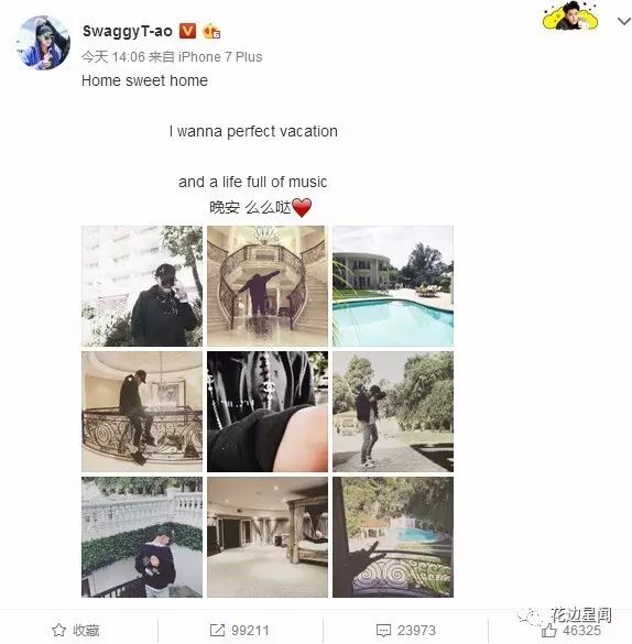 今天下午黄子韬在微博曝光了自己在美国比佛利山庄的豪宅。从照片来看其豪华程度简直堪比宫殿啦。宽阔宫廷式卧室,豪华旋转楼梯还有大游泳池,家中每一处景都不得不让人感叹:这得让人奋斗多少年啊~~