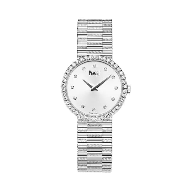 腕表采用白金链带打造,超薄设计让它能够柔顺服帖地与手腕链接,这正是伯爵工艺大师的艺术成果。银色镶钻表盘镶衬42颗圆形美钻,彰显复古魅力,诠释伯爵的传统工艺风格。