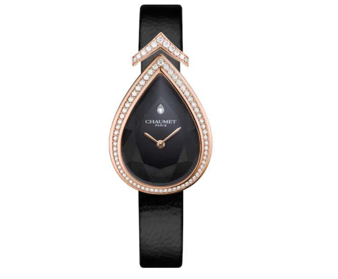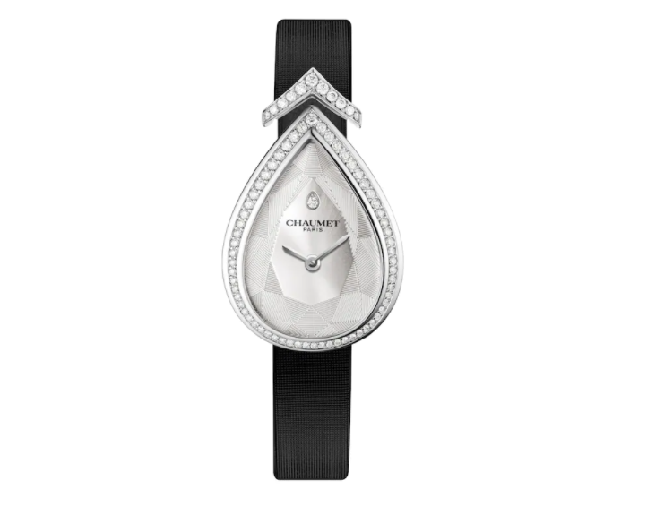 腕表来自CHAUMET著名的 Joséphine Aigrette 系列,充满女性气质的腕表以雕花表盘重新诠释了约瑟芬皇后心爱的梨形切工,从V形白鹭到表盘上装饰的“错觉画法(trompe-l'oeil)”钻石时标,这款珠宝时计都彰显了 Joséphine 系列极具代表性的标志。