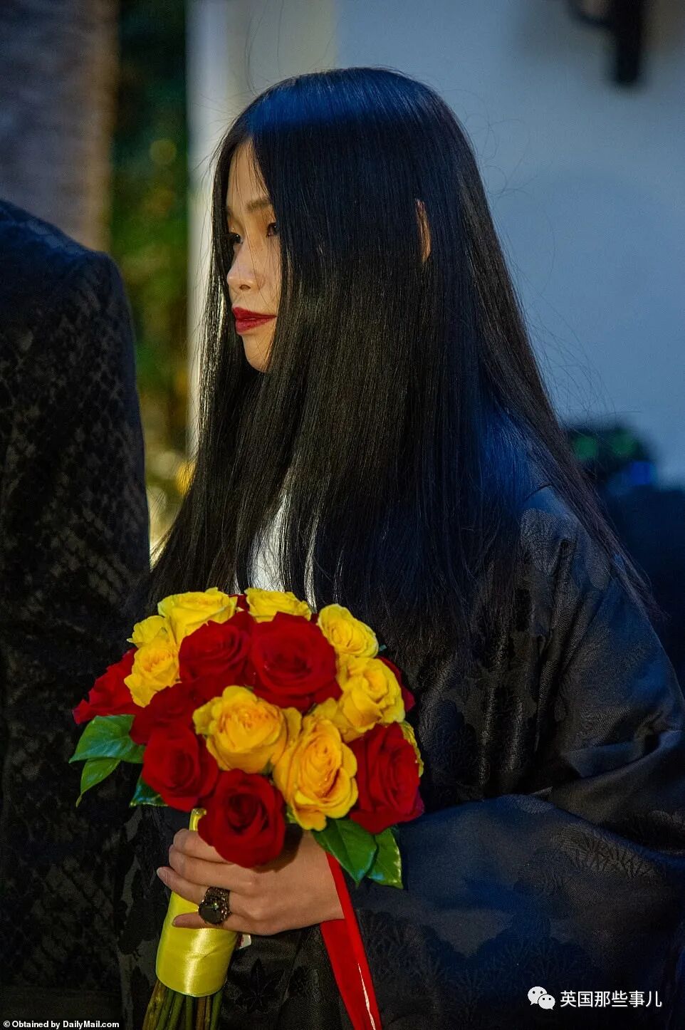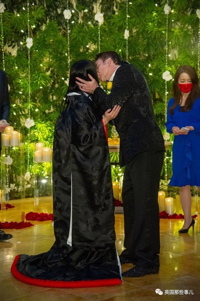 新娘穿着来自京都的黑色新娘和服,手握黄红玫瑰花束,手上戴着那枚凯奇为她定做的黑色钻戒。