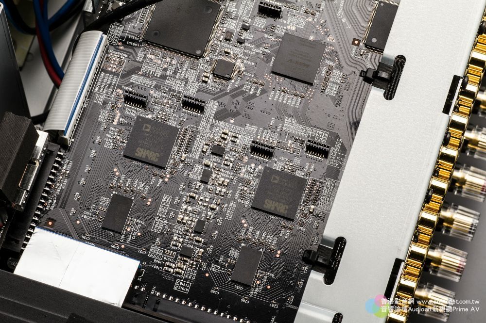 从2014年至今,Denon的中、高价位环绕扩大机都搭载了4枚Analog Devices的SHARC DSP芯片作数字音频处理,但是这回AVR-X8500H却只用了两枚SHARC DSP芯片,难不成这回反而是“降级”?事实恰好相反,芯片的效能与时俱进,Denon先前已经用了四年的SHARC DSP是ADSP-21487,它的最高运算效能是450 MIPS、四枚加总为1,800 MIPS,X8500H改用的ADSP-21571每一枚有两个SHARC核心,每个核心各有500 MIPS的运算能力,两片ADSP-21571加总就是2,000 MIPS、而且内建的RAM与ROM性能也比旧款DSP芯片高出甚多,所以确实是升级。
