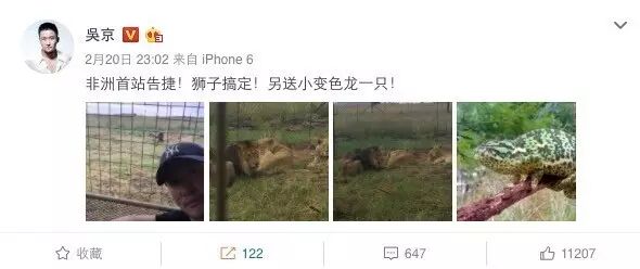 “非洲首战告捷!狮子搞定!另送小变色龙一只”,刚到非洲的吴京就迫不及待地开了工。昨日,他微博上晒出与几只雄狮的合影,看来《战狼2》又迎来一位新角色。图片中吴京头戴棒球帽近距离地站在狮子旁边,表情轻松,可谓是艺高人胆大。早在去年,吴京在为《战狼2》采风去到非洲时,就拍到了很多动物尸骸遍野的画面,看得人触目惊心,环境远比想象中的更恶劣。相比《战狼》里斗狼,这次跟狮子拍戏,肯定要更加惊险。