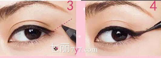 Step4:然后再将眼线上扬延伸,眼线往上延伸刚刚做记号处,也是先大致描绘线条,不需要画的太精细。