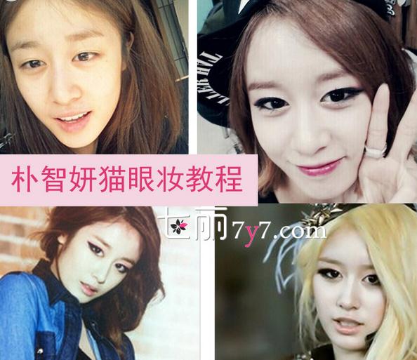 妆前妆后对比:没化妆的朴智妍双眼无神,而且还清晰可见黑眼圈,妆后的朴智妍瞬间变化女神气质,最经典的就是,非常的魅惑性感,很多女生都想拥有这样一款猫眼妆,下面就教大家韩式猫眼妆教程,菜鸟化妆的你也可以一学就会!