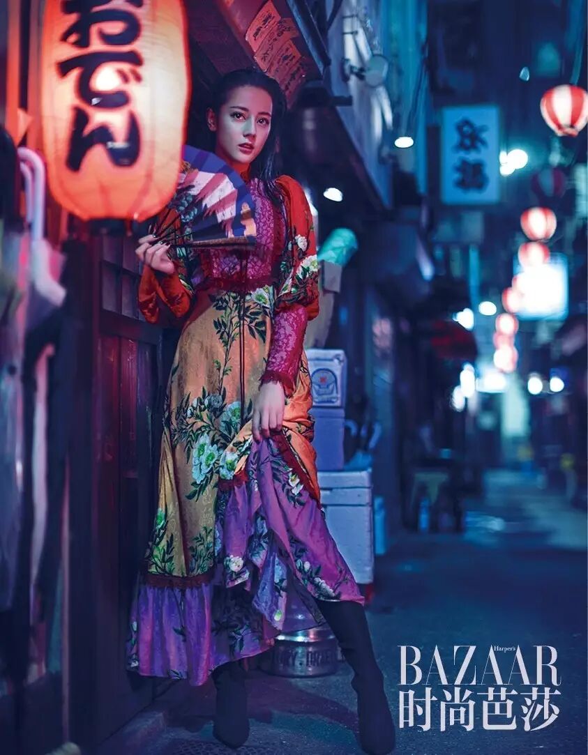 迪丽热巴:撞色拼接印花连衣长裙 in Gucci、