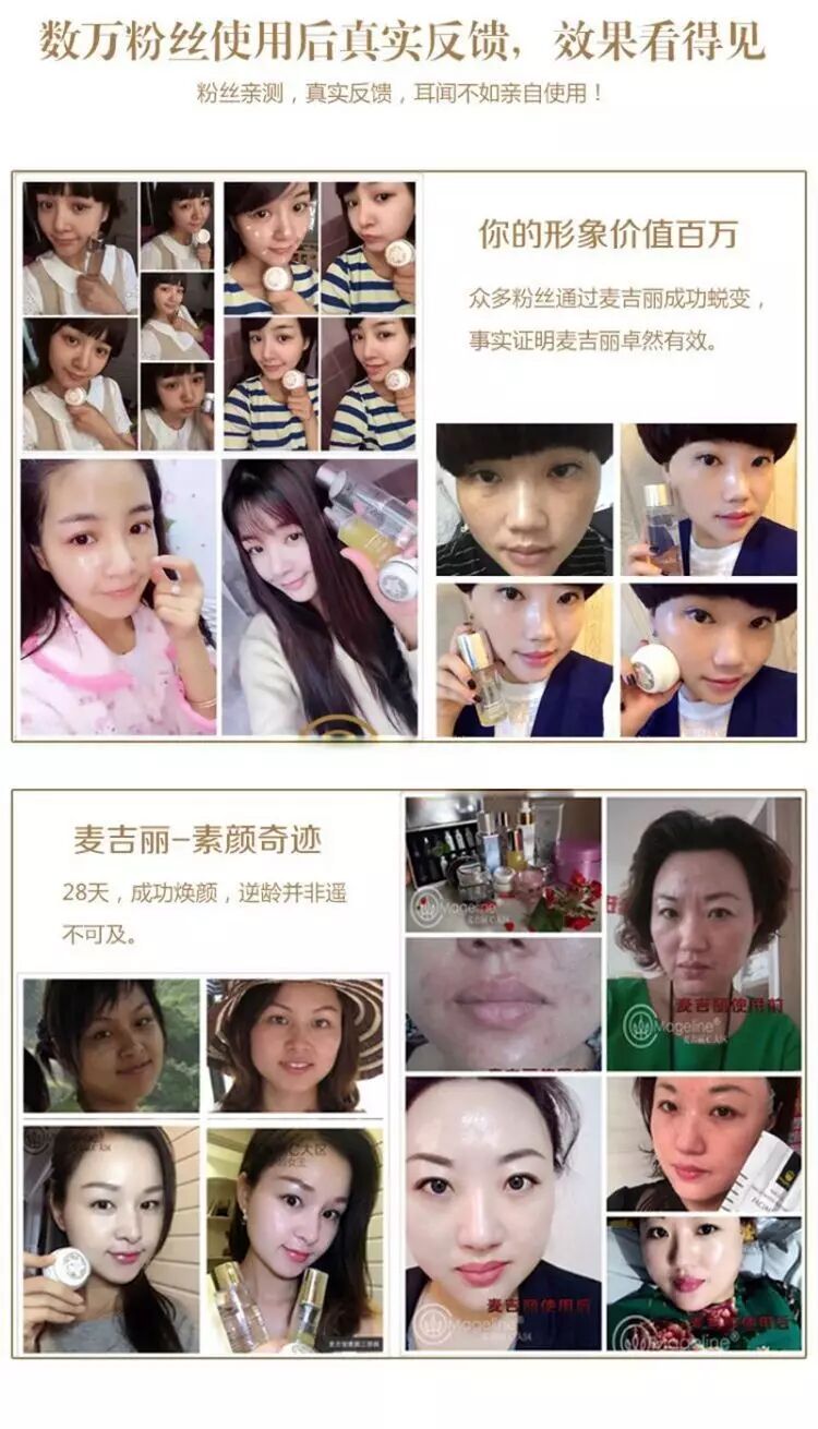 我在之前总是不停的更换护肤品牌,什么好就买什么,化妆台上摆满了大大小小的瓶瓶罐罐,不但没有改善肌肤,反而把肌肤弄成了敏感肌,过敏、脱皮现象严重,两颊处更是护理不当长了色斑,皮肤变的暗黄无光泽!自从用了麦吉丽素颜三部曲之后,皮肤变得白皙透亮细腻有光泽,脱皮现象没有了,色斑也淡化了很多,效果明显看的见!身边的人朋友、同事看见我的变化后都在使用!素颜三部曲的功效和魅力强大到让你甩掉那些瓶瓶罐罐,脱离美颜相机,三步搞定,素颜也可以美美的出镜!