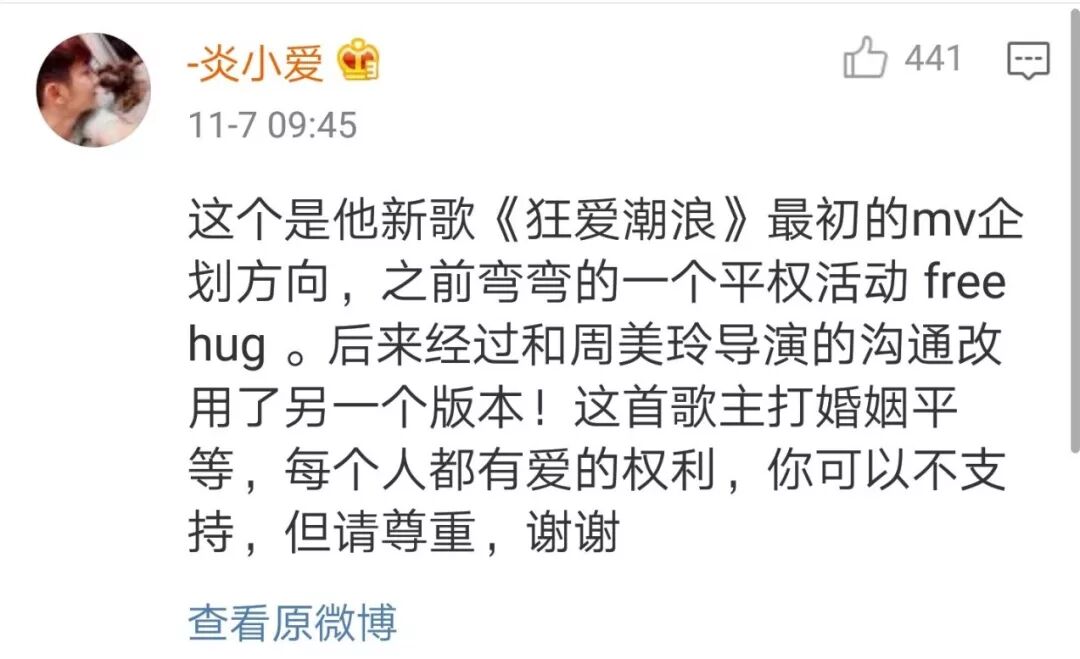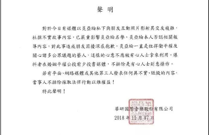 声明还直接上升到“炎亚纶一直是位捍卫平权的艺人,爆料者在台湾婚姻平权公投前夕爆料媒体,不排除是刻意以此抹黑台湾平权”的高度上。
