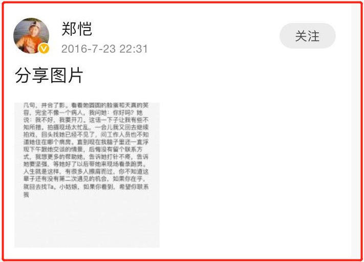 郑恺在2016年在肿瘤医院取景拍戏的时候偶遇了一位即将做开颅手术的小粉丝。