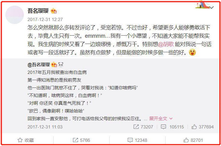 有个微博名叫“吾名璎璎”的女生在去年跨年的时候,在微博上讲述了自己过去一年经历患病的痛苦与和男友分手的无奈。