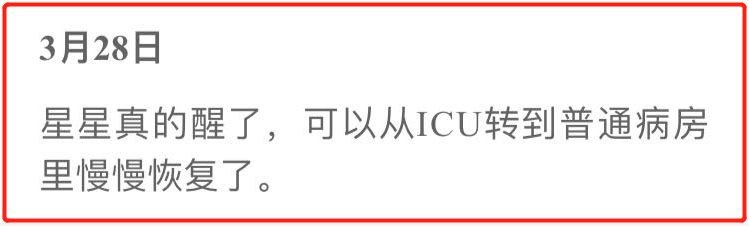 3月28日,持续听歌两个月的星星终于清醒并从ICU转到了普通病房。