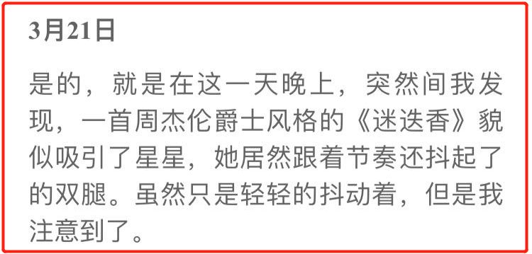 3月21日,星星第一次对周杰伦的歌做出了反应。听着爵士风格的《迷迭香》,星星的双腿会不由自主的随着歌曲的节奏微微抖动。
