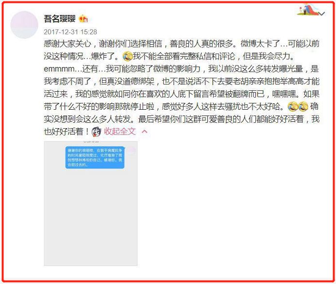 于是之后便在微博上发布了一则“寻人启事”,写到“我想更多地帮助她,告诉她打针不疼,告诉她要坚强,等她好了带她来现场录跑男。”