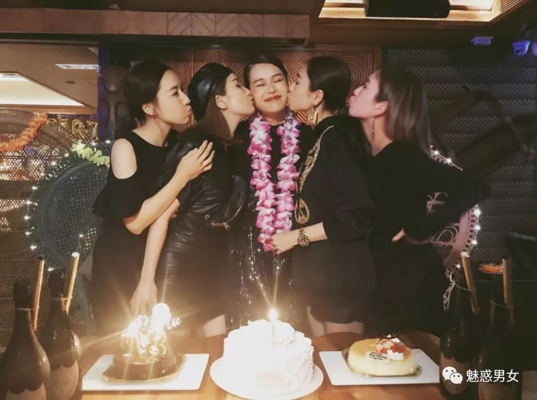 胡杏儿闭上眼睛站在中间,享受“胡说八道会”姐妹帮的亲吻祝福,不过成员之一姚子羚在拍照时还没未赶到现场。