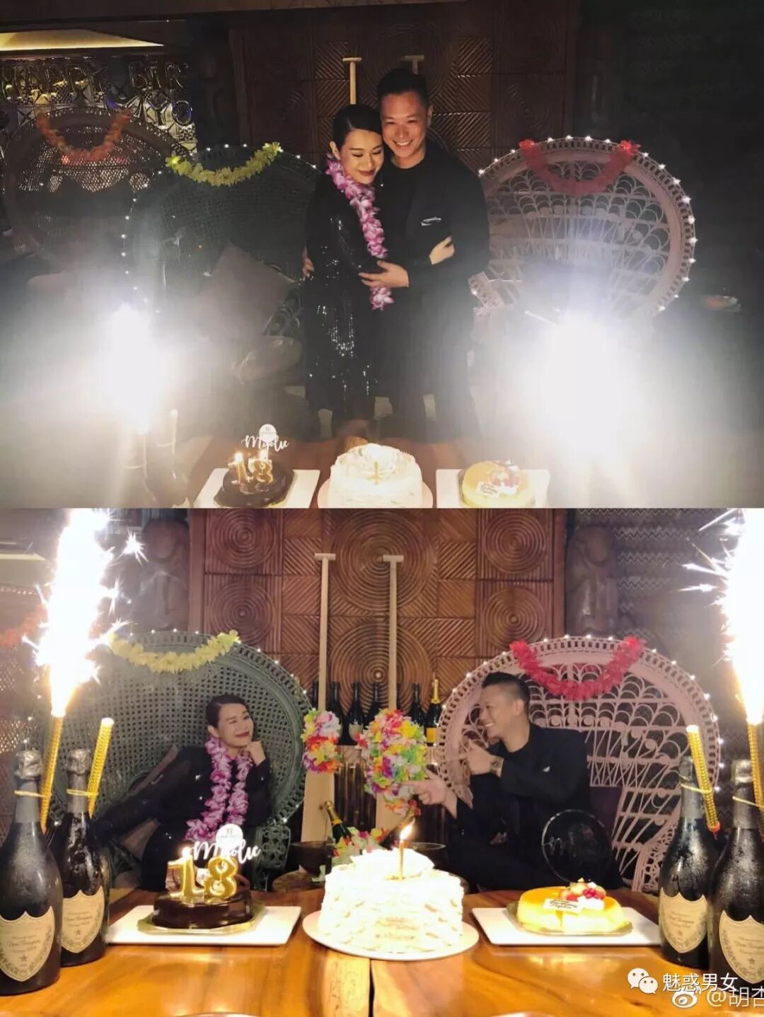 胡杏儿与老公李乘德的单独合照。两人或环抱在一起或坐在编织椅上,桌前摆了3个大蛋糕和四瓶香槟,在烟火的衬托下整个聚会氛围十分融洽。
