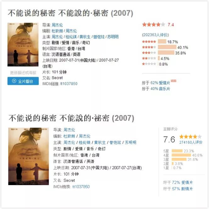 至今为止,周杰伦一共有两部自导自演的电影,还是比较少见的类型——华语歌舞片。和许多华语导演一样,职业生涯最悲哀的一点就是出道即巅峰。处女作《不能说的秘密》豆瓣7.6分,第二部《天台爱情》6.8分,从国产青春片的整体环境看,纵不算佳作,也值得一看。