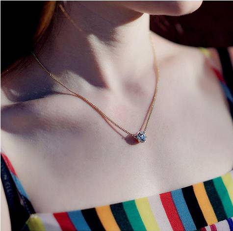 这一款是玫瑰金钻,金色的链子,配上一颗精致简洁的单钻,无论是冬天搭配毛衣还是夏天搭配裙子,都能给自己的造型加分不少。
