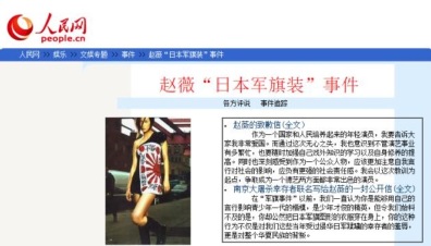 在一次杂志拍摄中,赵薇赫然披着日本军旗上阵。