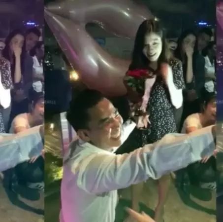 求婚现场还被朋友们拍下来,柯有伦单膝跪地,现场不止求婚被求婚的人满脸喜悦,围观的朋友们也是同款喜悦脸。