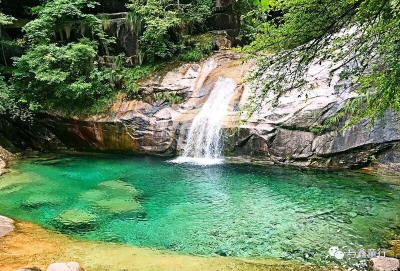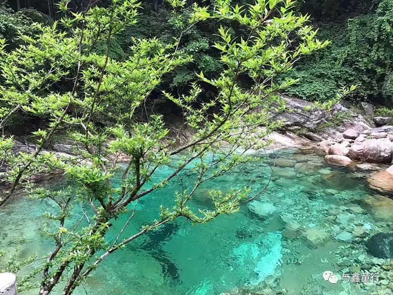 翡翠谷是黄山脚下最长的峡谷,纵深约20公里。谷中分布着一百多个形态各异的彩池,池水晶莹剔透,在阳光下会呈现出不同的颜色,绚丽多彩,像一颗颗翡翠散漫谷中,因此得名“翡翠谷”。这碧蓝的池水弥补了我从未去过九寨沟的遗憾。