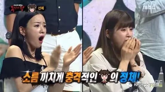 先艺揭开面罩后,全场哗然一声,而坐在宾席的艺人们纷纷大吃一惊,万万没想到先艺会出现在节目上~ 担任来宾的后辈歌手们如Apink初珑和普美看得目瞪口呆!
