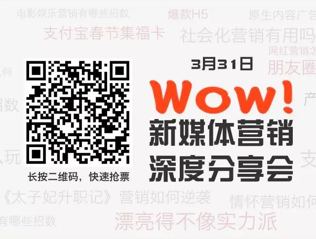 当然还有大咖云集的案例分享,比如支付宝春节福卡咻一咻、《太子妃升职记》花式哭穷营销、坚果手机“漂亮得不像实力派”引爆UGC……乐视生态营销总裁张旻翚、蚂蚁金服品牌与公众沟通部资深总监陈亮、人人网CMO曹淼、锤子科技UX产品总监朱萧木 、文案大神李叫兽等等等等等也将出席和我们分享他们的经验与洞见。