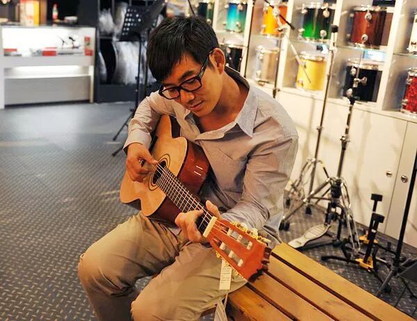 穿着花衬衫、沙滩裤,抱着吉他。三十多岁的样子,有点没正经。