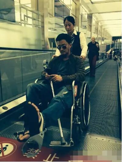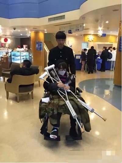 12月20日,吴京在微博晒出妻子谢楠脚部受伤和自己之前腿受伤的照片。照片中,谢楠戴着口罩,怀抱拐杖,披着厚外套坐在轮椅上,一只脚受伤缠着白色的纱布。