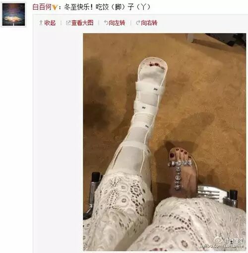 12月22日,白百何在微博晒出左腿受伤的照片,并打趣称:“冬至快乐!吃饺(脚)子(丫)。” 照片中,白百何坐在轮椅上,腿上缠着绷带和石膏,包的严严实实的,犹如饺子。