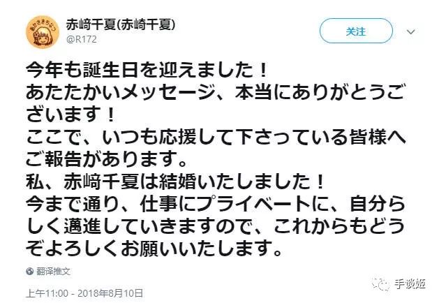2018年8月10日,正是千夏小姨子的31岁生日,在庆贺生辰的同时她也在推特上公布了自己已经结婚的消息。