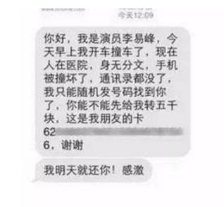 “李易峰”发出短信称因车祸需要借钱,小心是诈骗 金华网警巡查执法 内地男星 2016-06-13 14:31:51 142 创作不易,用心坚持,欢迎请BaGua喝几杯爱心咖啡!打赏并支持本文 打赏并删除本文 金华婺城反信息诈骗中心 某日,李易峰在北京驾车撞上桥墩,骗子竟然抓住机会,发出诈骗短信:“我是李易峰,需要你打钱……”骗子们借着这个“大好时机”,绞尽脑汁编的短信内容有:“您好,我是演员李易峰,今早开车撞车了。现在人在医院,身无分文,手机被撞坏了,通讯录都没了,我只能随机发号码找到你,你能不能先给我转5千元,明天就还你!感激。”短信中还附着银行账号。 创作不易,用心坚持,欢迎请BaGua喝几杯爱心咖啡!打赏并支持本文 打赏并删除本文 感谢您的支持鼓励,我会继续努力的!文章地址:用户邮箱:打赏金额:USDT 请输入数字点击”去打赏“,即可进行打赏支持本文章哦 李易峰 About the Author 金华网警巡查执法 功能介绍:网上犯罪防范警示提示,网上违法行为告知警示 Related Posts “李易峰”发出短信称因车祸需要借钱,小心是诈骗 2016-06-13 14:31:51 发表评论
