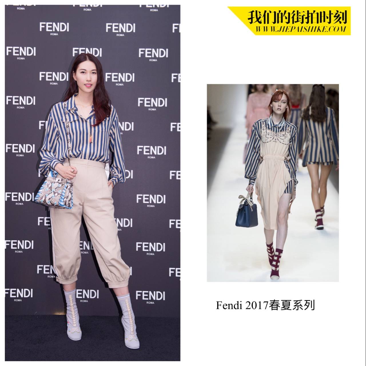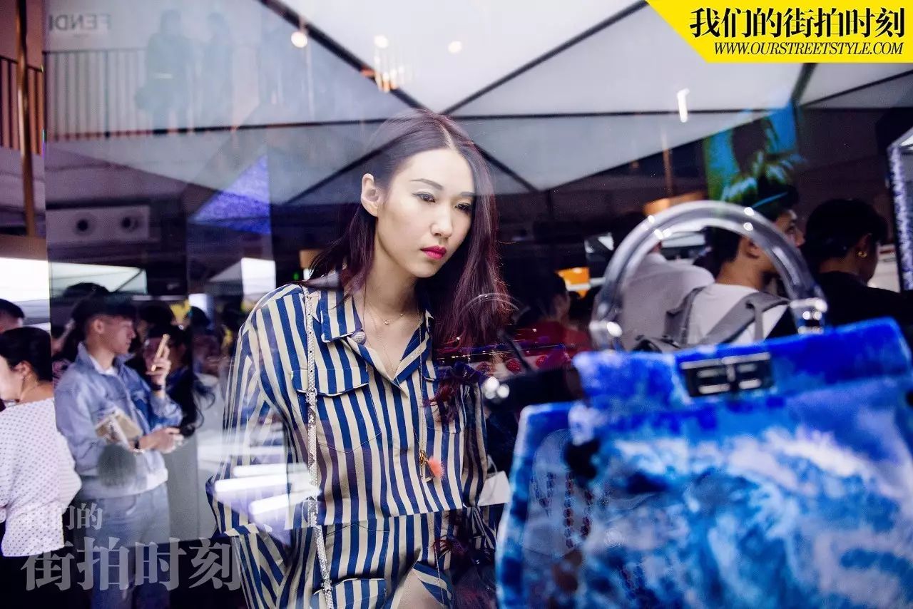 晖老板今天身穿FENDI2017春夏蓝白条纹真丝衬衫搭配高跟鞋,立马腿长两米。