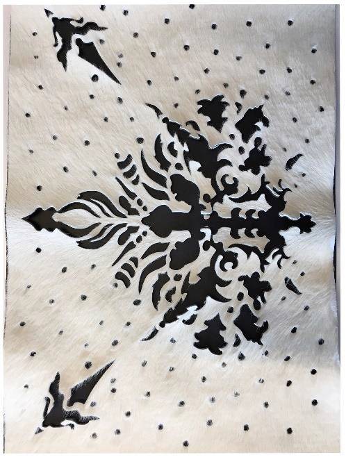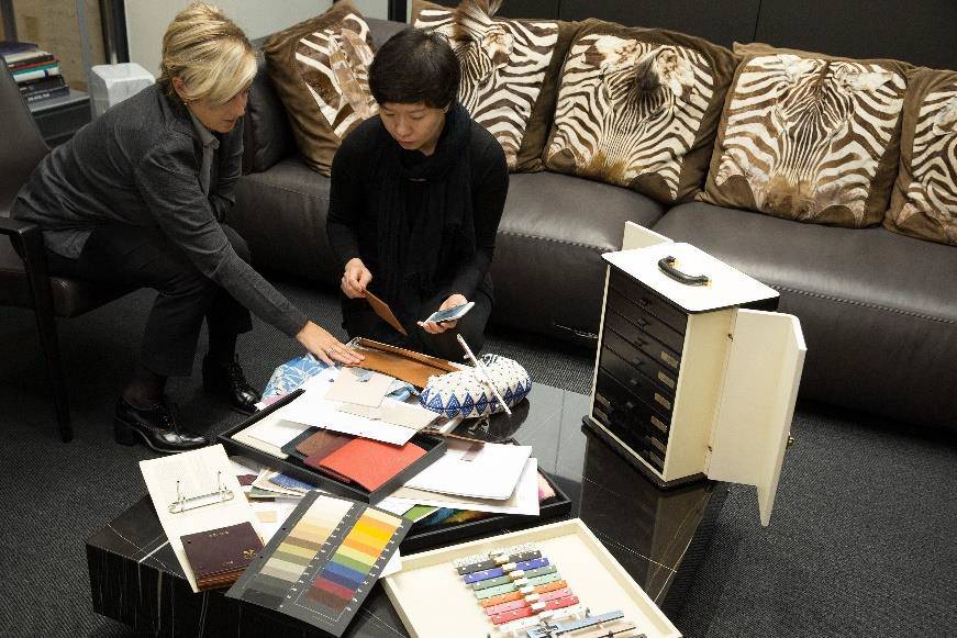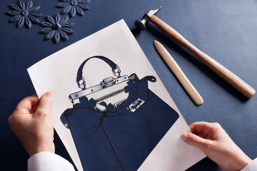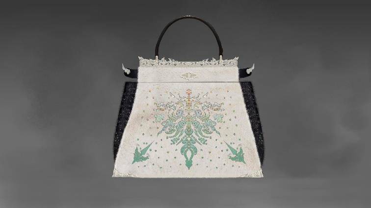 叶锦添设计了一款中号的手袋,这一原创设计极为珍贵,马毛上先以水刀切割出极为细致的图腾并于其上饰有由水晶所拼出的图案。