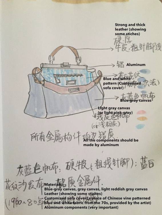 她更提供了一块来自年代的饰有藤蔓图案的中式面料,将其图案用于这款手袋的内层。