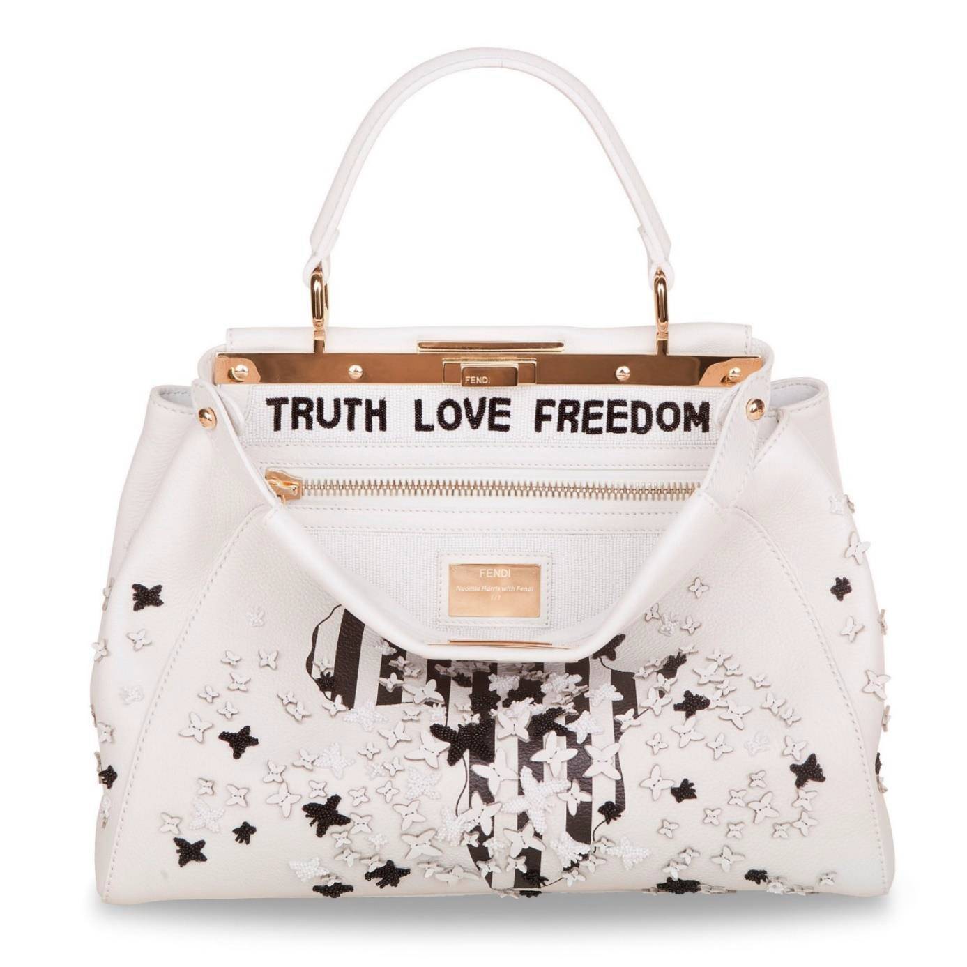 各种各样的真皮或珠饰3D蝴蝶,刺绣三维立体效果,让人觉得它们要振翅高飞。在手袋的内侧压印“TRUTH – LOVE – FREEDOM”三个单词,彰显这款手袋的主题。