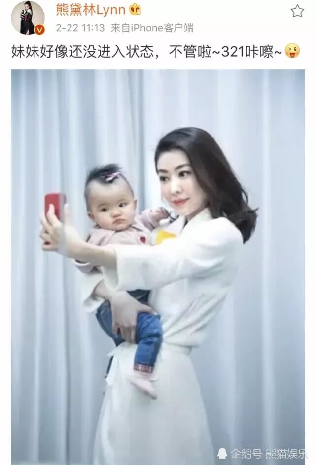 2月22日,熊黛林在社交网站上晒出了和女儿的照片,还用调皮的语气调侃道:“妹妹好像还没进入状态,不管啦~321咔嚓~”。