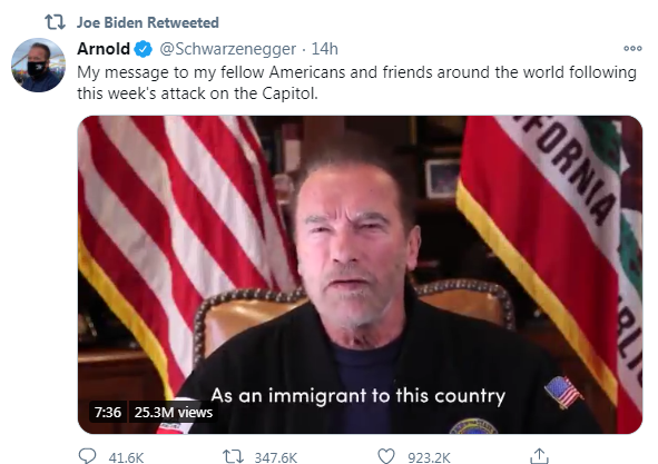 值得注意的是,美国当选总统拜登10日晚些时候也转发了施瓦辛格的这段视频。↓