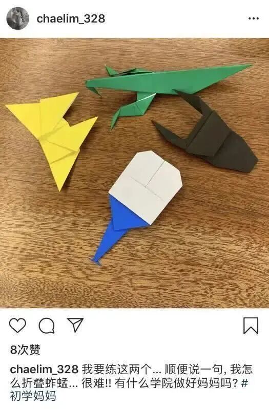 前几天,蔡琳还有在ins分享一张照片,因为儿子小礼物想要折纸蚱蜢,蔡琳发文感慨说好难啊,有什么学校可以教怎么做好妈妈吗?