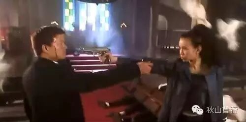 上图是暴力美学大师吴宇森的代表作《喋血双雄》中的一幕,为了升华影片人物的境界,吴氏枪战片中总会出现教堂和鸽子。周星驰似乎对吴宇森的这个点情有独钟,不止一次地恶搞。