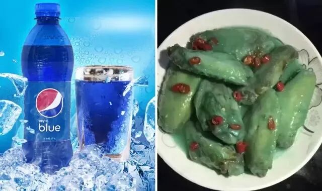 @橘子:朋友圈同学晒的生日礼物,她男朋友给她用蓝色可乐做的可乐鸡翅,看了一点胃口都没有了…