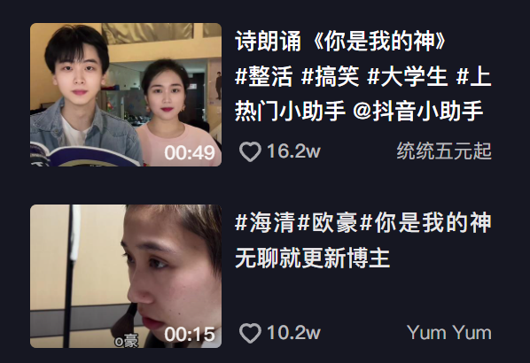 就像我本人,第一次听见海清高喊“你是我的神”时,我忍不住地调小了音量、迅速关掉了视频,不忍再看欧豪的表情。