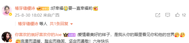 陈乔恩的婚姻故事也引发了网友热议:“好幸福,要一直幸福哟,爱情最美好的样子,是我从你的眼里看见你和他的世界,浪漫而温暖,踏实而稳固,坚定而勇敢!六年快乐。