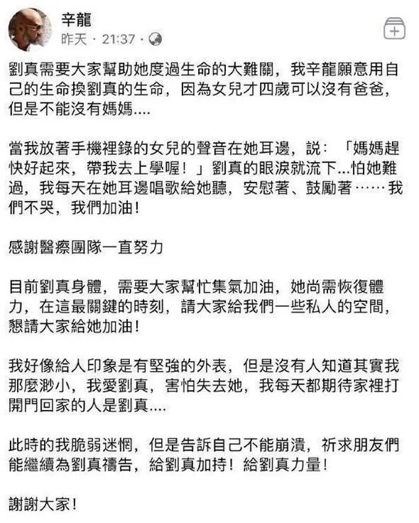 辛龙此前还曾两度在网络发声,希望外界能帮刘真集气祈祷,帮助她渡过难关。
