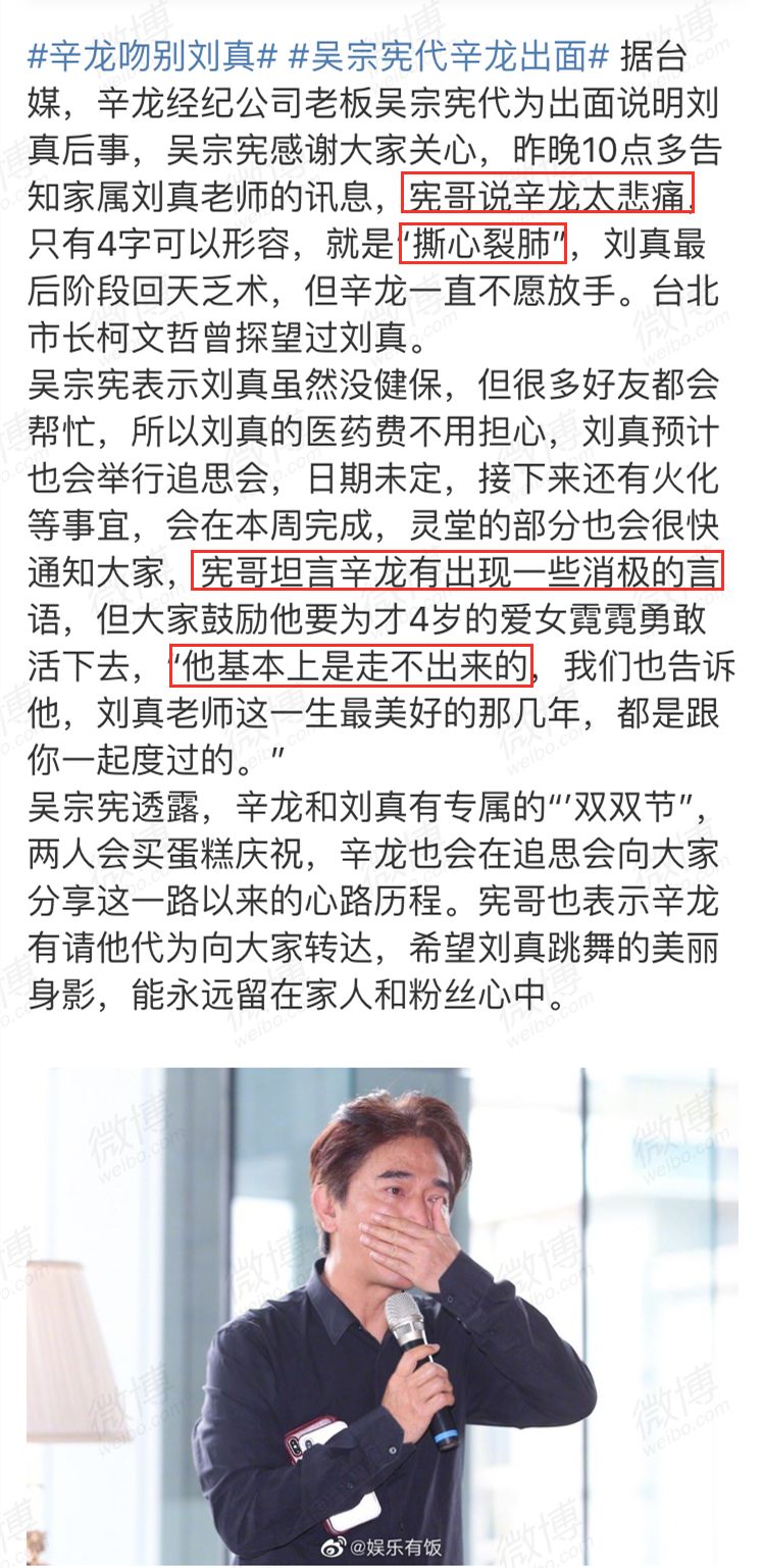 刘真出事后,辛龙备受煎熬,一度失联,只能吴宗宪代为出面,感谢粉丝们的关心。